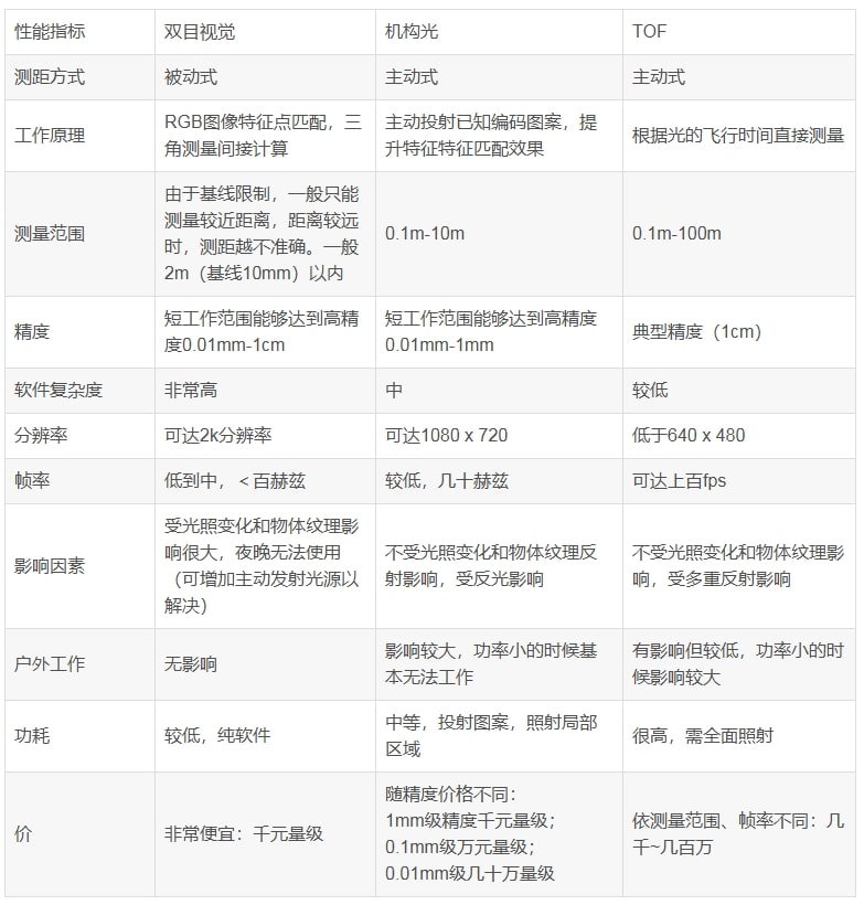 首页 动态 目前主流3D视觉技术各有什么优劣势?如何选择最Match的工业3D相机? 目前主流3D视觉技术各有什么优劣势?如何选择最Match的工业3D相机? 技术科普 2024-08-12 浏览量:1984 什么3D相机?3D相机与2D相机相比有什么差别? 3D相机,也被称作深度相机,与传统的2D相机相比,它能够多获取物体到相机的距离信息,即深度信息,结合2D图像的X和Y坐标,可以计算出每个点的三维坐标,从而实现三维重建、目标定位、导航避障等功能。 3D机器视觉可以完成许多2D机器视觉无法完成的任务。 以零件检测为例,下图零件表面有一划痕、边沿有凹陷。传统的2D机器视觉只能依靠表面图像颜色的不连续来判断是否缺陷,但此案例中,缺陷和零件表面反光颜色接近,判断难度很大,3D相机可以得到表面凹凸的深度信息,从而准确的判定划痕和边缘的凹陷。 此外,目前3D视觉技术在高精度检测、高精度测量(例如弯管、不规则件)、智能分栋、装配(引导机械臂在三维空间内避障和定位)、物流车导航等更多场景中实现了相较于2D机器视觉更为广泛的应用覆盖。 主流3D技术对比 3D相机的工作原理主要有三种技术:双目立体视觉、结构光和ToF(Time of Flight),还有其他市面上常见和新技术发展起来的相机种类。 1. 双目立体视觉基于视差原理并利用成像设备 从不同的位置获取被测物体的两幅图像,通过计算图像对应点间的位置偏差来获取物体三维几何信息。 一般立体视觉相机指的是被动式双目立体视觉相机,而主动式双目立体视觉相机是在双目立体视觉的基础上,增加了主动发射光源(通常是红外光)来辅助获取深度信息的相机系统,这种系统结合了被动双目视觉和主动发射光源的优势。 1. 被动式双目立体视觉相机 【优点】1)硬件要求低,功耗低,成本低。普通 CMOS 相机即可; 2)室内外都适用,尤其适合在户外工作; 3)适用于纹理丰富的场景。 【缺点】1)对环境光照非常敏感。光线变化导致图像偏差大,进而会导致匹配失败或精度低; 2)不适用单调缺乏纹理的场景。双目视觉根据视觉特征进行图像匹配,没有特征会导致匹配失败; 3)计算复杂度高。该方法是纯视觉的方法,对算法要求高,计算量较大; 4)基线限制了测量范围。测量范围和基线(两个摄像头间距)成正比,导致无法小型化。 2. 主动式双目立体视觉相机 通常是指在双目立体视觉的基础上,增加了主动发射光源(如红外光)来辅助获取深度信息的相机系统。这种系统结合了被动双目视觉和主动发射光源的优势。国内304am永利集团智能是研究该领域的专业企业。 【优点】1)低光场景可用:可在户外使用,同时也可在低光或无光环境工作,提高图像可见度和深度测量准确性; 2)增强纹理信息:为缺乏纹理的表面增加必要纹理信息,适合表面光滑和颜色单一场景; 3)降低环境光干扰:使用红外或特定波长的光源可以减少环境光变化对系统性能的影响。 【缺点】1)功耗增加:使用外部光源可能会增加系统的功耗,尤其是在需要长时间运行的应用中。 2)安装和校准:需要更精确的安装和校准过程,以确保光源和相机之间的正确对齐。 结构光 通过近红外激光器,将具有一定结构特征的光线投射到被拍摄物体上,再由专门的红外摄像头进行采集。这种具备一定结构的光线,会因被摄物体的不同深度区域,而采集不同的图像相位信息,然后通过运算单元将这种结构的变化换算成深度信息,以此来获得三维结构。 根据编码图案不同一般有:条纹结构光、编码结构光、散斑结构光。 【优点】1)方案成熟,相机基线可以做的比较小,方便小型化。 2)资源消耗较低,单帧 IR 图就可计算出深度图,功耗低。 3)主动光源,夜晚也可使用。 4)在一定范围内精度高,分辨率高,分辨率可达 1280x1024,帧率可达 60FPS。 【缺点】1)容易受环境光干扰,室外体验差。 2)随检测距离增加,精度会变差。 TOF 顾名思义是测量光飞行时间来取得距离,具体而言就是通过给目标连续发射激光脉冲,然后用传感器 接收从反射光线,通过探测光脉冲的飞行往返时间来得到确切的目标物距离。 因为光速激光,通过直接测光飞行时间实际不可行,一般通过检测通过一定手段调制后的光波的相位偏移来实现。 TOF 法根据调制方法的不同,一般可以分为两种:脉冲调制(Pulsed Modulation)和连续波调制 (Continuous Wave Modulation)。 脉冲调制需要非常高精度时钟进行测量,且需要发出高频高强度激光,目前大多采用检测相位偏移办法来实现 TOF 功能。简单来说就是,发出一道经过处理的光,碰到物体以后会反射回来,通过捕捉来回的时间计算距离。 【优点】 1)检测距离远:在激光能量够的情况下可达几十米。 2) 受环境光干扰较小。 【缺点】 1)对设备要求高,特别是时间测量模块; 2)资源消耗大。 该方案在检测相位偏移时需要多次采样积分,运算量大。 3)边缘精度低。 4)限于资源消耗和滤波,帧率和分辨率都没办法做到较高。 三种技术性能对比 上一个:【最全选型攻略】挑选合适的工业相机,必须提前考虑12要素! 返回列表 下一个:3D机器视觉可以完成许多2D机器视觉无法完成的任务。 更多新闻推荐 端到端 更易用丨304am永利集团®散料运输动态监测与预警系统全新上市 新品上市 2025-02-20 小尺寸 更灵活丨304am永利集团3D相机PEA020-800-Y80S上新,助力多场景智造升级 新品上市 2024-09-29 【最全选型攻略】挑选合适的工业相机,必须提前考虑12要素! 工