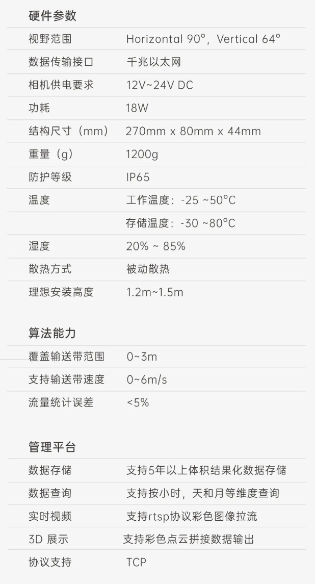 首页 动态 端到端 更易用丨304am永利集团®散料运输动态监测与预警系统全新上市 端到端 更易用丨304am永利集团®散料运输动态监测与预警系统全新上市 新品上市 2025-02-20 浏览量:164 在各类涉及散料运输的行业场景中,普遍面临着诸多棘手问题,严重影响生产效率、成本控制以及生产安全,作为具备端到端能力的 3D 视觉智能化解决方案专家,304am永利集团机器人公司正式推出软硬件一体化智能散料运输动态监测与预警系统,护航全场景散料运输,助力多行业生产效率提升。 方案介绍 304am永利集团®散料运输动态监测与预警系统 司眸® RGBD 智能相机 司眸®VAE020-800-X180是304am永利集团机器人公司最新自主研发的升级款 工业级RGBD感算一体式智能相机产品,基于双目散斑结构光感知技术,异构3D实时成像技术提供更精细的深度感知,在SLAM、三维重建技术加持下,提升点云数据精度和图像处理能力,升级的增强光学投射系统,缩短曝光时长,减少运动模糊,更适用于高速场景。 智能料流检测软件 304am永利集团公司智能料流检测软件,内置自研高精度料流测量算法,可全面监测输送带的运行速度、流量体积、堆料高度、块料大小、欠载状态、皮带跑偏等信息,实现输送带散货物流精细化监测。 监测管理平台 客户端软件支持实时视频查看、历史数据查询、实时人机交互控制。 系统功能 流量统计 司眸®VAE020-800-X180 RGBD 智能相机动态采集输送带上物料的三维数据,结合高精度流量体积测量算法,生成精准流量体积数据。 支持皮带速度:6m/s 数据查询:支持按小时、天和月等维度查询 自动测速 该方案能够自动测量输送带运动速度,确保及时发现异常,结合报警系统可防止设备故障或安全事故,同时实现料流精细化控制,优化输送调度,提升输送效率。 环境条件:需具备照明条件 覆盖输送带宽度:0 ~ 3m 块料检测 通过三维点云数据分析,能够识别自定义参数范围出现的块料,并突出标记,同时实时跟踪,并进行系统预警。 支持皮带速度:≤ 6m/s 块料参数自定义:支持 煤堆监测 实时监测料流高度,当发现料流高度过高可能导致物料堆积堵塞时,及时预警。 检测精度:毫米级 覆盖皮带宽度:0~3m 欠载检测 当检测到料流高度过低时,表明输送带此时处于欠载状态,系统可及时预警,消除生产安全隐患,提升生产效率。 检测精度:毫米级 覆盖输送带宽度:0~3m 跑偏检测 自主设定跑偏阈值,算法自动比较皮带实时偏移量和设定阈值,判断输送带是否偏离正常轨道,输出计算跑偏幅度和方向,显示具体数值,同时可及时发出警报。 检测精度:毫米级 覆盖输送带宽度:0~3m 核心优势 01 高精度测量,数据稳定输出 测量精度可达毫米级,测量结果与实际物料流量误差小于5%; 支持深度数据和RGB数据同步对齐输出; 02 超大景深,超宽视野 测量输送带宽度达3m; 测量堆料高度达1.5m; 03 部署简单,安装便捷 无需改变现场环境即可快速安装; 调试简单,系统易于维护; 04 端侧AI,架构简洁 数据传输延迟更低; 不需要额外工控机计算设备; 更省安装与维护成本; 05 一个平台,多个应用 单机实现散料皮带流量监控、堆煤、跑偏、测速等多种应用; 06 RGBD应用开发平台 司眸®RGBD智能相机可作为应用开发平台,持续衍生出更多闭环应用; 07 快速响应防爆需求 针对防爆需求,提供10mm厚度防爆玻璃解决方案,确保在防爆环境下正常使用而不影响3D成像效果; 方案能力 应用场景 Human+™304am永利集团®深耕机器视觉领域近十年,3D 视觉 AI 技术积累深厚,经过长期自主研发,现已推出A系列、P系列,T系列、AT系列双目 3D 相机产品,基于自研 3D 相机,为客户和合作伙伴提供端到端的「3D 视觉+AI 」 自动化解决方案,打造软硬件一站式闭环服务体验。 304am永利一直秉持以服务客户为中心,将技术与产品创新作为对客户、行业和社会应尽的责任。未来,Human+™304am永利集团®将坚持探索前沿科技创新,始终致力于各行业智能化转型升级,促进全社会生产效益提升。 上一个:小尺寸 更灵活丨304am永利集团3D相机PEA020-800-Y80S上新,助力多场景智造升级 返回列表 下一个:没有了 更多新闻推荐 小尺寸 更灵活丨304am永利集团3D相机PEA020-800-Y80S上新,助力多场景智造升级 新品上市 2024-09-29 目前主流3D视觉技术各有什么优劣势?如何选择最Match的工业3D相机? 技术科普 2024-08-12 【最全选型攻略】挑选合适的工业相机,必须提前考虑12要素! 工业相机 2024-07-16 场景应用丨304am永利集团智能智能煤流监测系统全新升级,赋能自动化煤流管控 场景应用 2024-07-08 场景应用丨304am永利集团智能3D视觉+AI深度学习,助超大型货物体积测量更准,更稳,更易用 场景应用 2024-06-04 超高读取 极致易用丨304am永利集团智能发布RGBD动态包裹体积测量智能相机 新品发布 2024-04-26